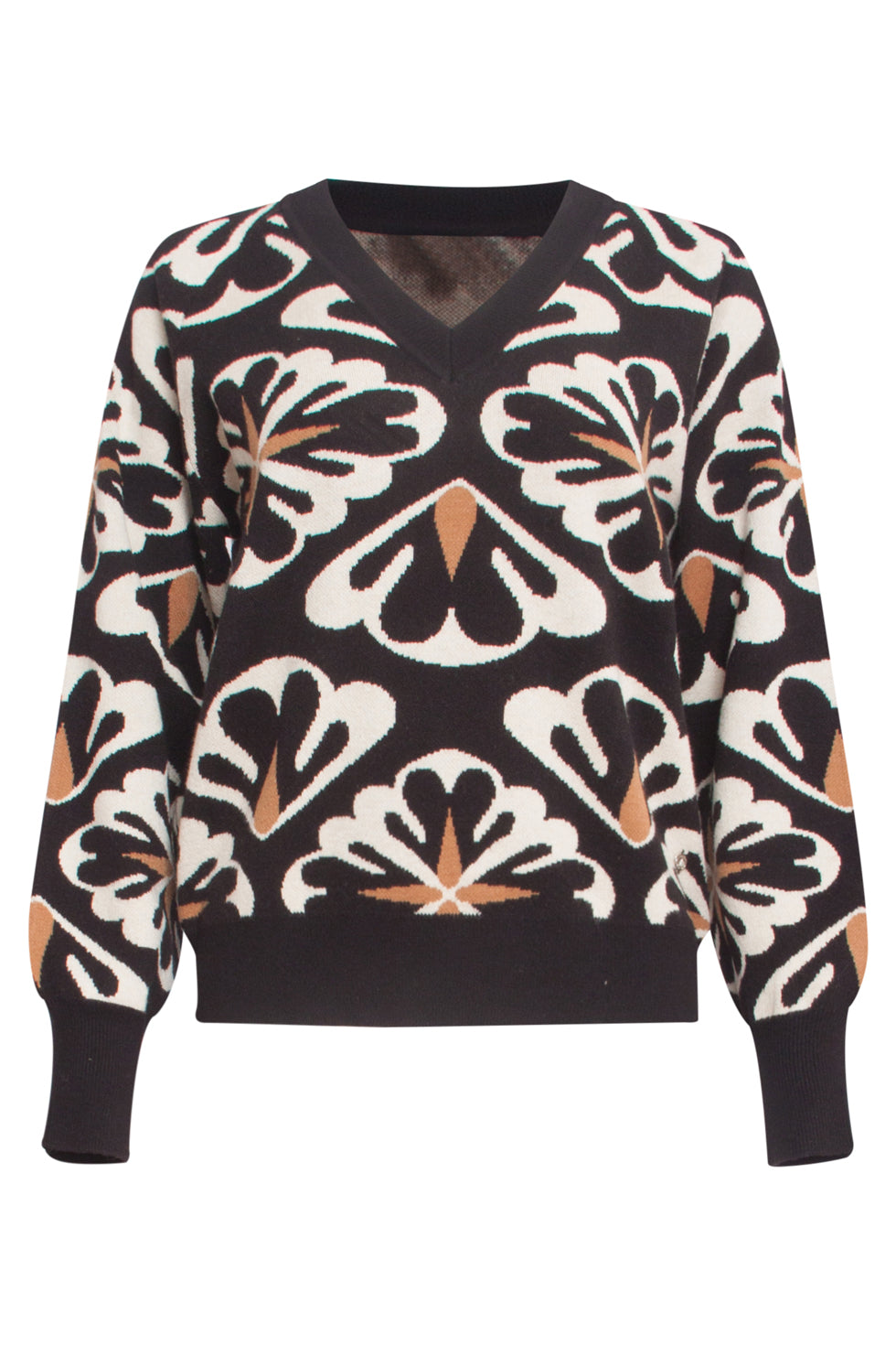 This oversized knitted sweater features a black base color with a sand-colored graphic floral pattern and a V-neckline. The loose fit ensures a relaxed silhouette, while the detailed pattern visually enhances the design. Thanks to its versatility, the sweater can be worn both as a single layer and in a layered look, combining a textured and at the same time casual appearance.