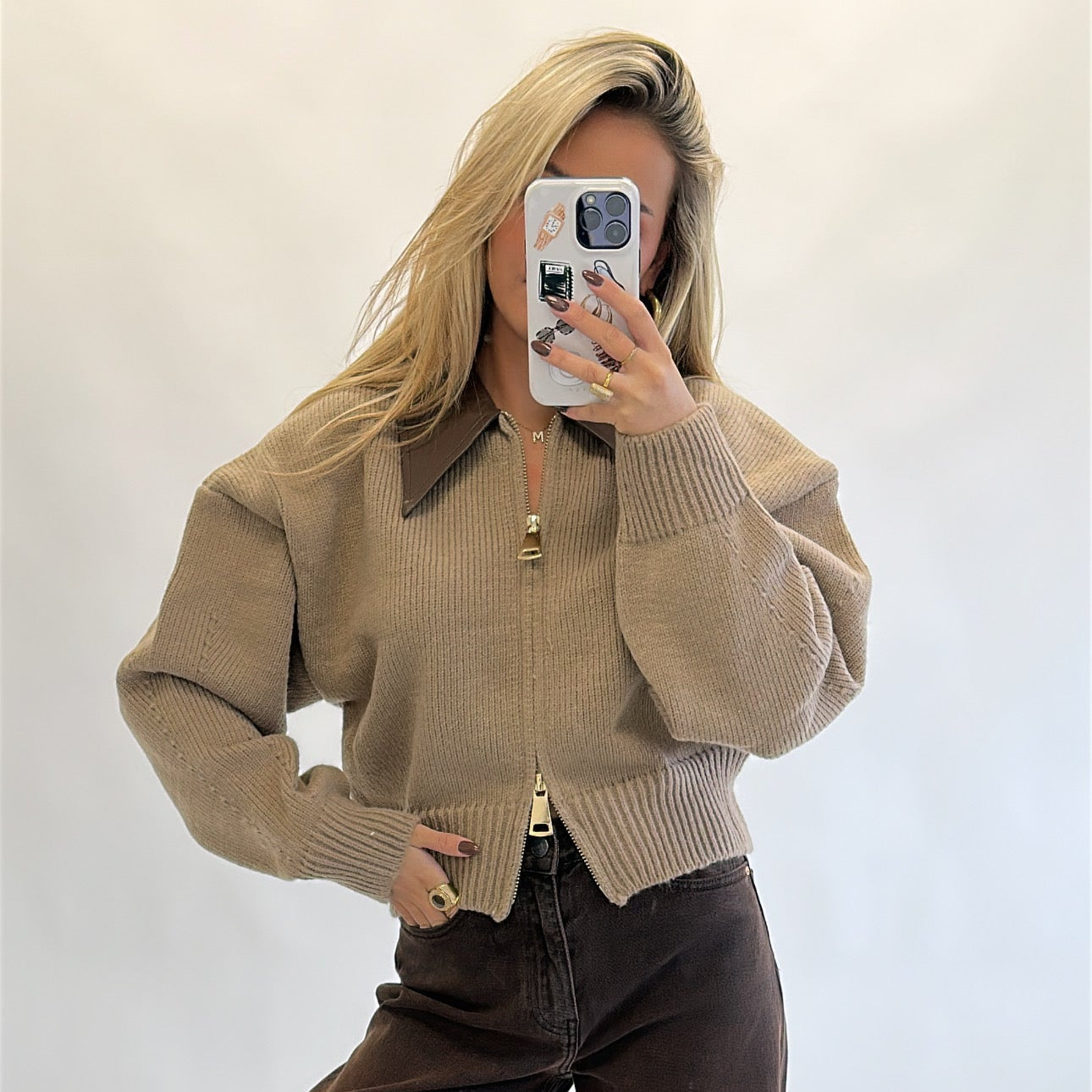 This knit zip sweater features a leather collar and two gold-colored zippers for versatile styling. It can be worn open for a relaxed look or closed for an elegant appearance. The soft, lightweight knit provides a comfortable feel, while the slightly oversized fit offers freedom of movement. Available in cream and taupe, the sweater combines subtle details with functional design for everyday wear.