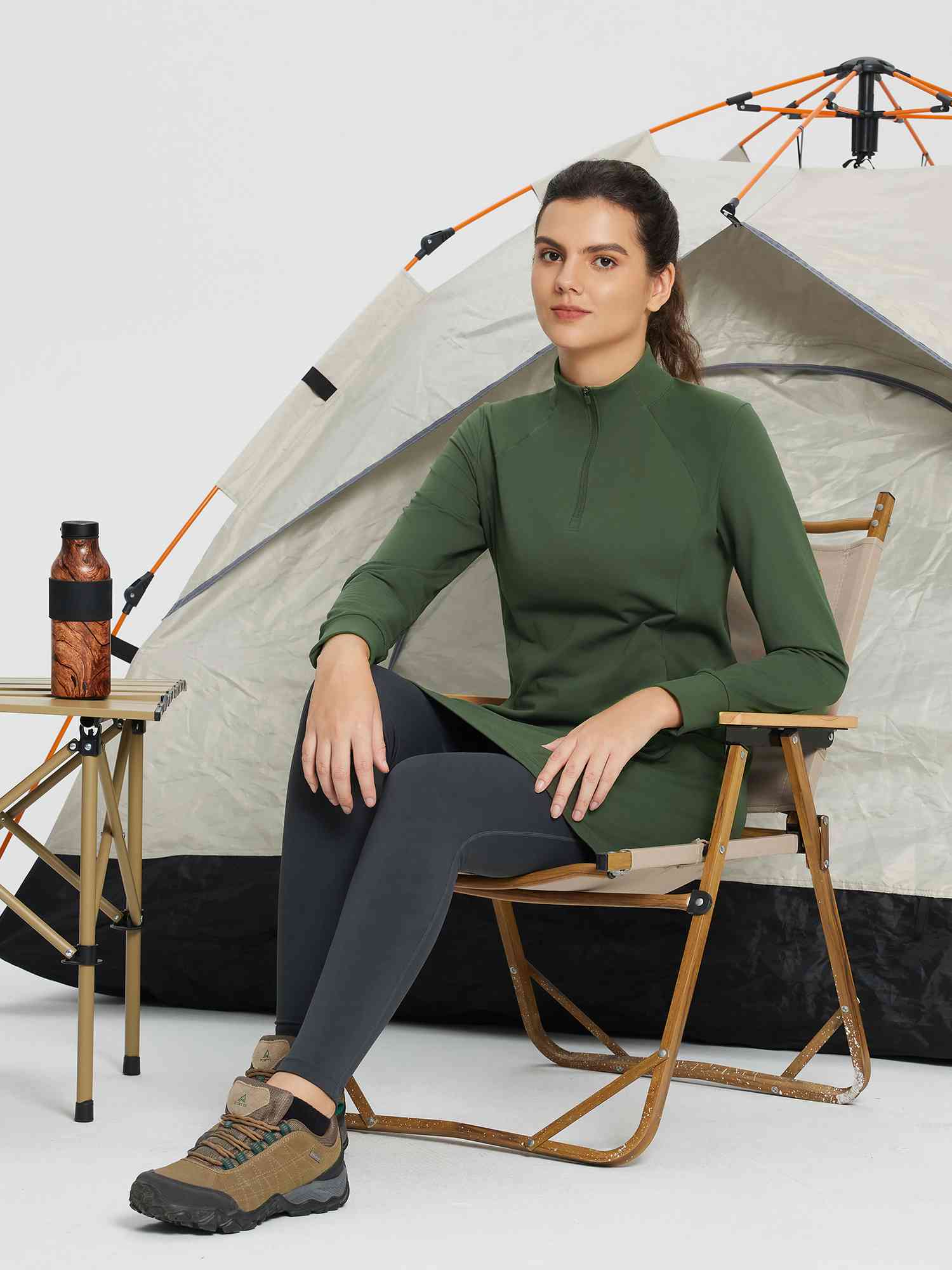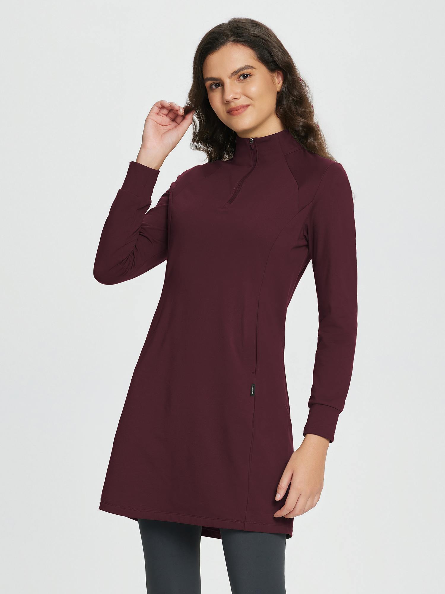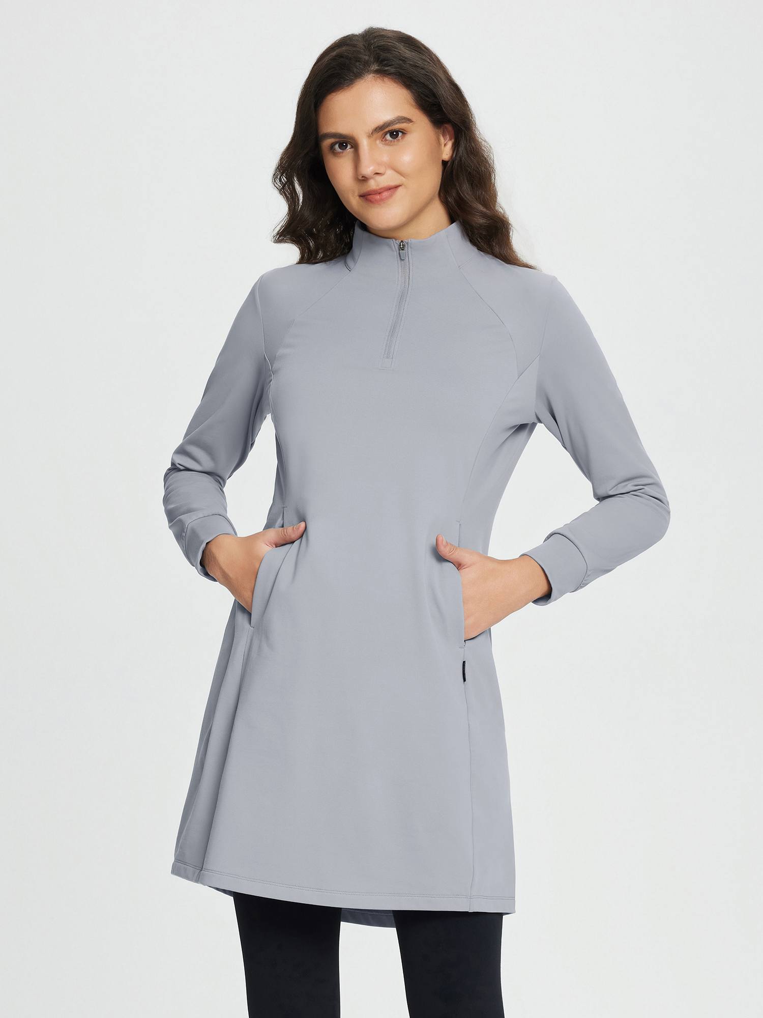 This women's winter dress features a structured A-line silhouette that supports freedom of movement during outdoor activities and everyday wear. The stand-up collar with zipper allows for adjustable coverage, while the slitted hem provides extended mobility. Side pockets offer practical storage for small everyday items without compromising the clean shape. The above-the-knee length is ideal for layered looks, making the dress suitable for walks, light activities, or daily use in cooler temperatures. The simple design allows for easy pairing with vests, jackets, or additional outer layers without bulk.