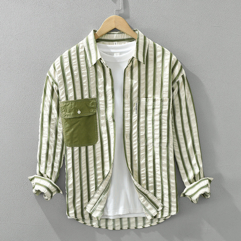 This men's shirt with a vertical stripe pattern features a loose fit, long sleeves, and a classic button placket, making it ideal for everyday wear. The vertical stripe pattern provides a neat, modern appearance, while the relaxed shape allows freedom of movement. Versatile in use, it can be worn with both trousers and jeans.