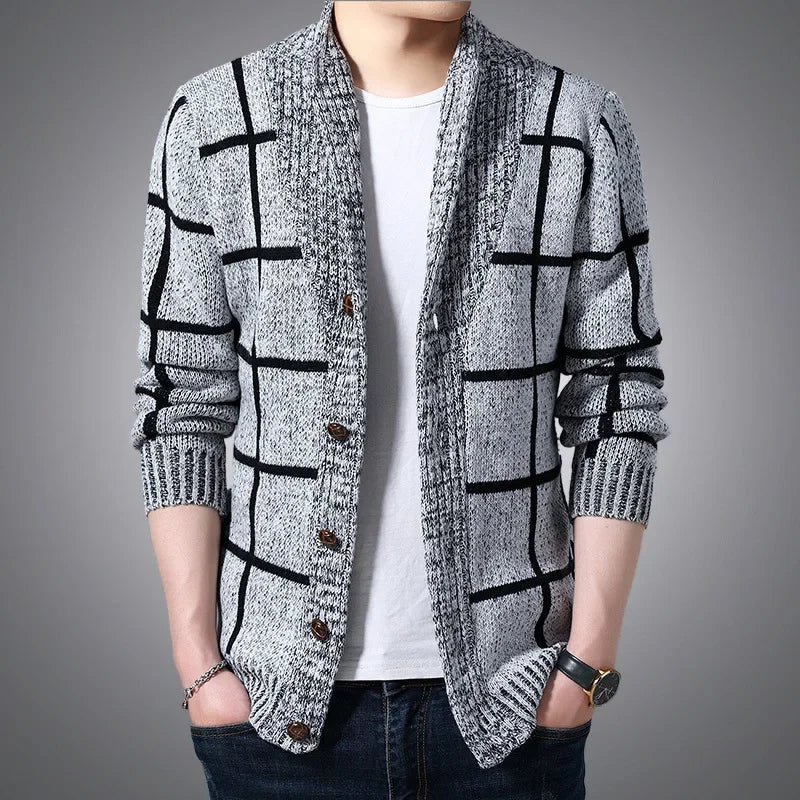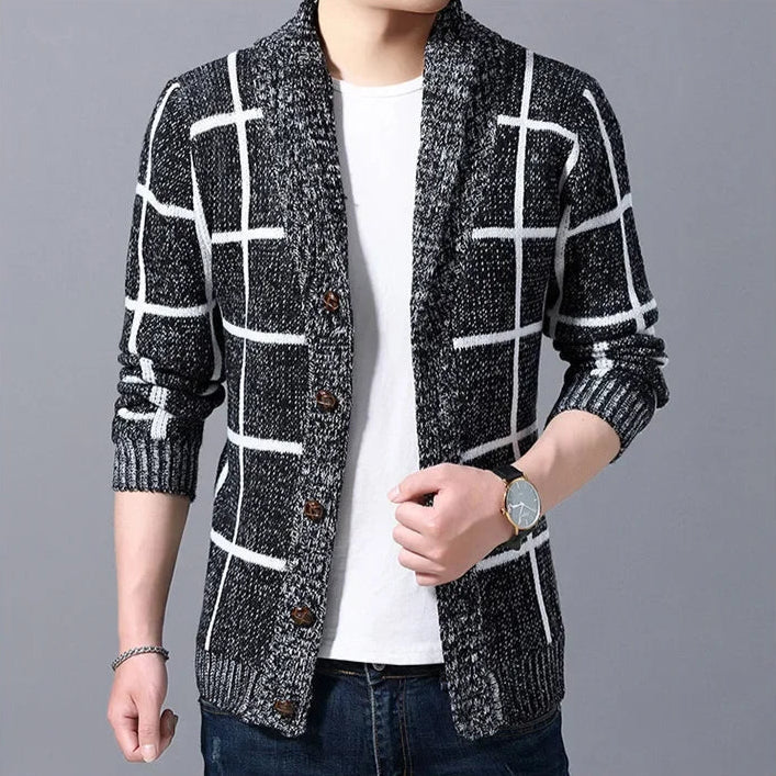 Men’s Knit Cardigan with Checkered Pattern, Button Placket, and Ribbed Edges