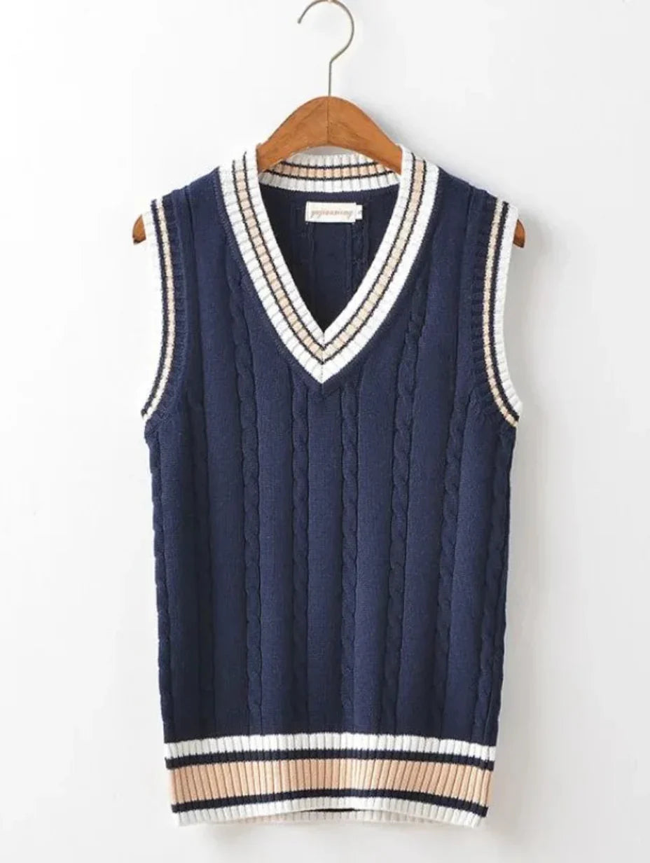 This sleeveless knitted vest features a clear V-neck and a pullover texture, making it ideal for layered outfits. The sleeveless cut ensures unrestricted freedom of movement and makes the vest perfect to wear over shirts—both for formal and everyday occasions. The balanced shape pairs excellently with trousers, chinos, or uniform-style looks, while the plain surface makes the design versatile and adaptable for various events. The vest is designed for regular use when simple layering and easy styling without added bulk are desired.