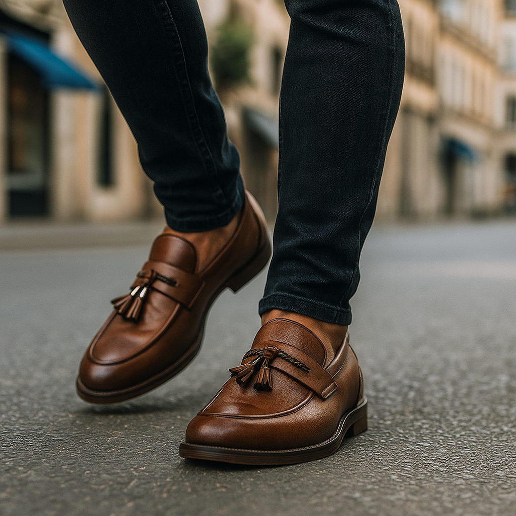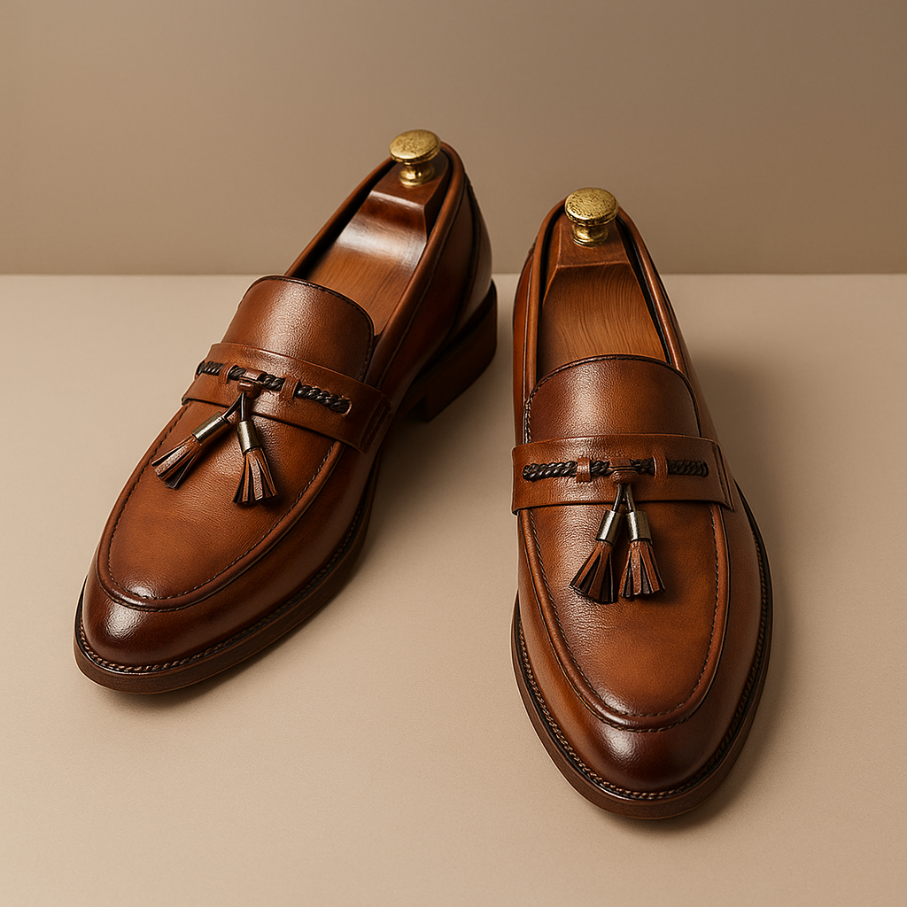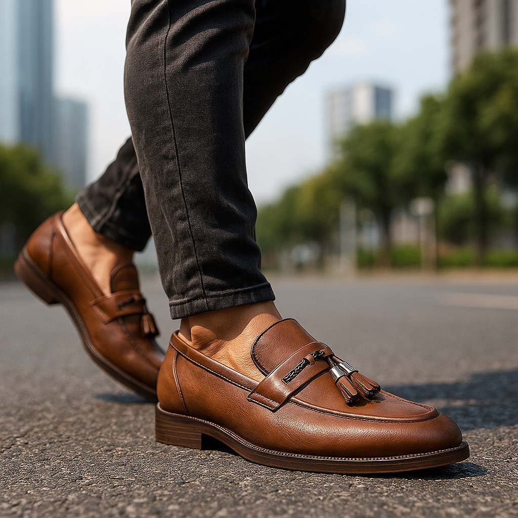 These men's slip-ons feature a polished surface with a braided strap and double tassels arranged on top. The insole is equipped with extra cushioning for regular wear, while the stitched sole and low heel provide a structured base for daily and semi-formal use. The slip-on design keeps the overall look practical and clean, without unnecessary elements.